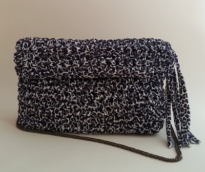 Feia molt que tenia pendent fer una bossa de mà per a la meva germana. Aquest animal print, impensable per a mi, és ideal per a ella. Ja se sap: tants caps, tants barrets. Quan el vaig veure a Trap-art vaig saber que l'havia de comprar. És de lycra i hi he treballat amb un ganxet de 10 mm.